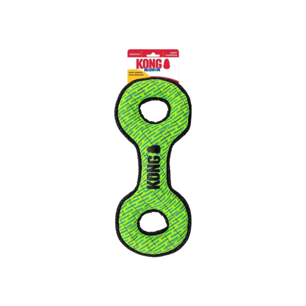 O KONG Armor Double Tug foi criado para cães que amam desafios de força e interação intensa. Com duas alças resistentes e corpo reforçado, este brinquedo é perfeito para brincadeiras de cabo de guerra, puxar, chacoalhar e interagir com o tutor ou com outros cães.