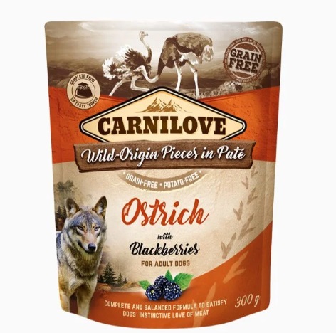Proporcione ao seu cão uma experiência de alimentação deliciosa e saudável com o Carnilove Paté de Avestruz com Amoras!