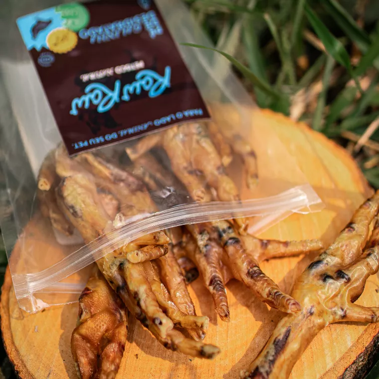 O Pé de Galinha Desidratado é um petisco natural, é uma proteína palatável e que possui Vitaminas, Cálcio, Ferro, Ômega 3 e 6. De dureza média, é ótimo para enriquecimento ambiental e mental ou para agradar seu cão ou gato. Esse petisco pode ser oferecido inteiro ou quebrado em pedaços menores e sempre com supervisão