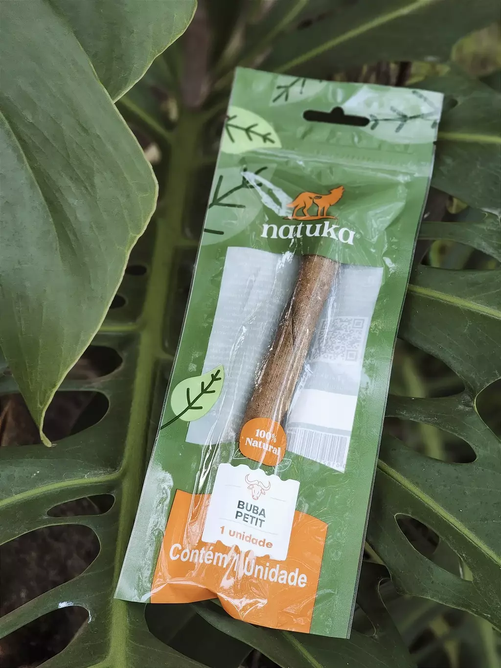 Natuka Buba Petit: é a versão ideal para cães de pequeno e médio porte. É um mastigável composto unicamente por couro de búfalo sem pelos, é um dos nossos mastigáveis mais resistentes para animais de porte pequeno e médio. Seu formato espiral o torna bastante atrativo e traz mais resistência sem que o animal ingira uma grande quantidade de couro. Ideal para cães de mordida forte.